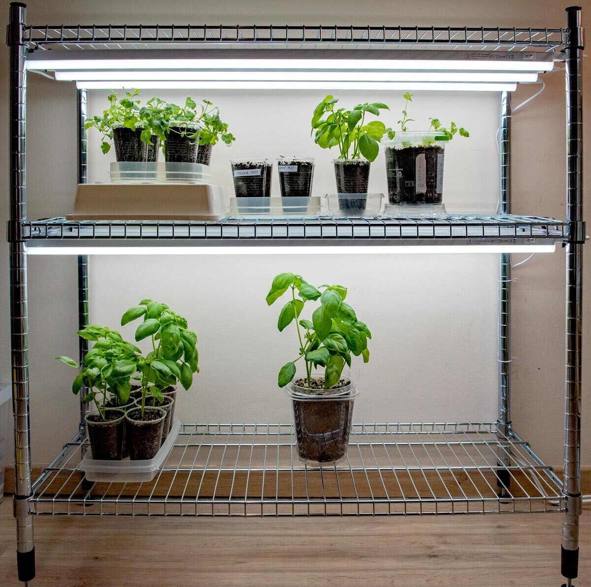 The setup is simple as you will just need a few items, which can be reused for many years to come. It’s an investment that saves you money on buying transplants every spring. Yes, this means less secret trips to the nursery and shredded receipts. As much as I would love to just give you amazon links to everything, I don’t actually think that is the most affordable way to build this. You’ll want to visit a garden center for the plant trays, and I will give you links for the lighting and shelving.